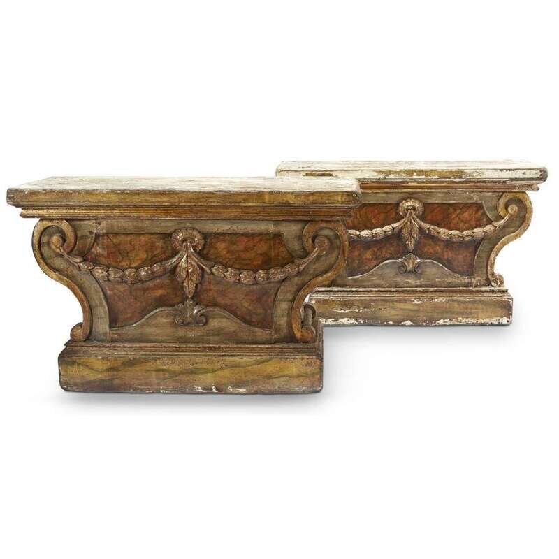 Of altar form, with rectangular tops and voluted sides, each centering a marbleized shaped panel with garlanded swag ornament, on stepped molded bases, the faux marble distressed to a state of elegant decay. (2).