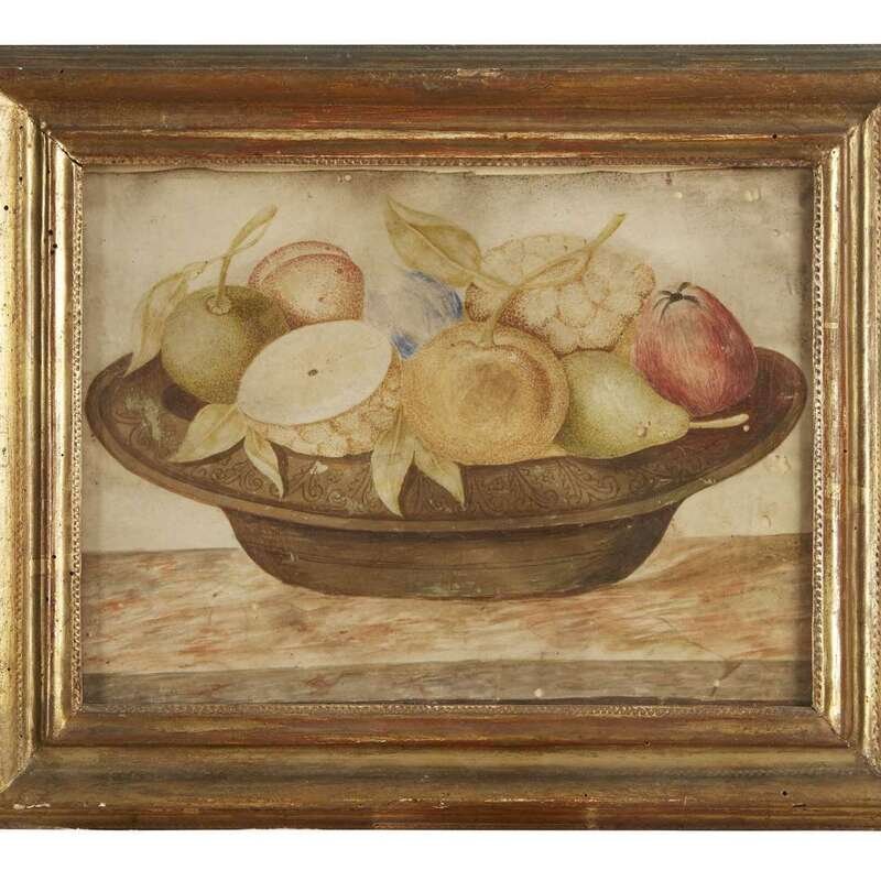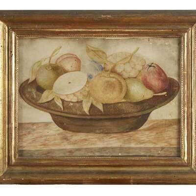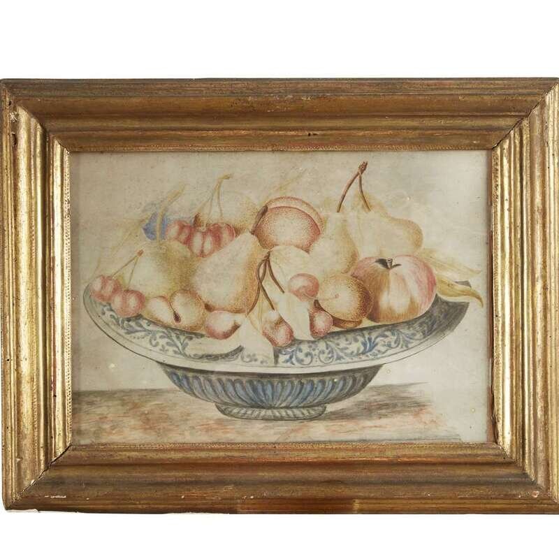 Depicting two still lives of bowls of fruit, painting in watercolor on vellum. (2).