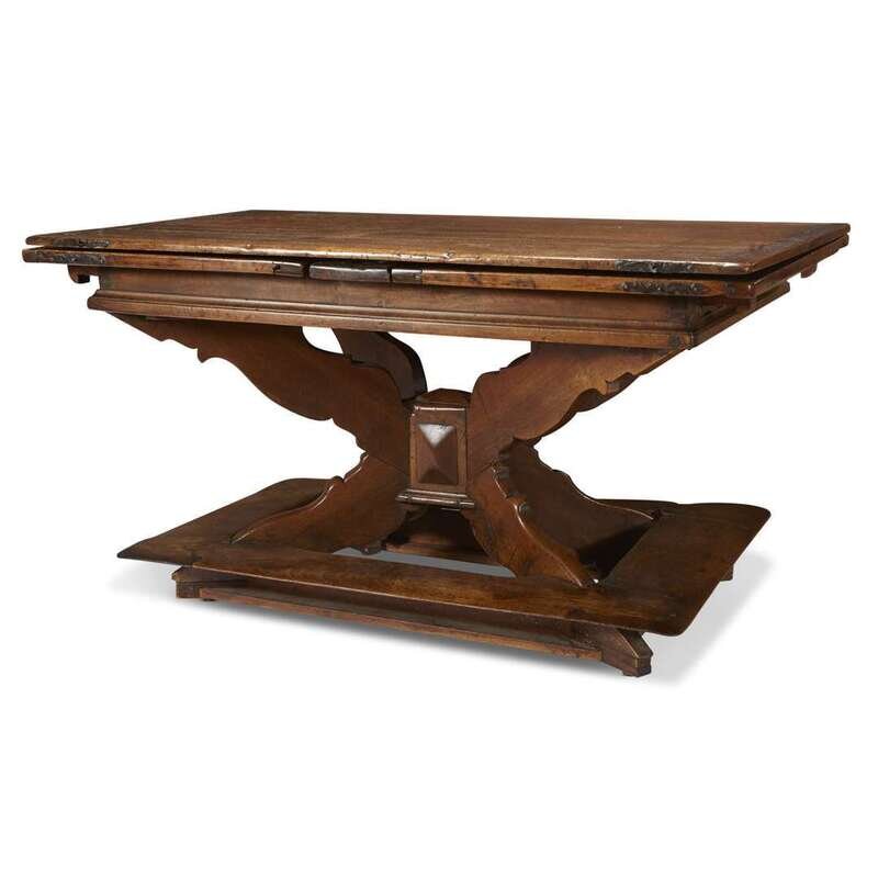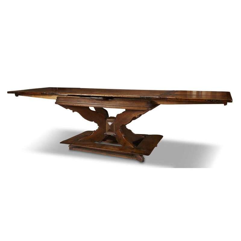 An unusual Swiss Baroque extending walnut dining table with 18th century elements
