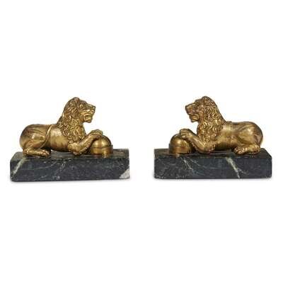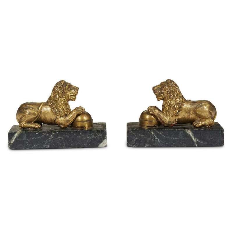 The recumbent lions with their paws resting on half globes, now mounted on verde antico marble bases. (2).