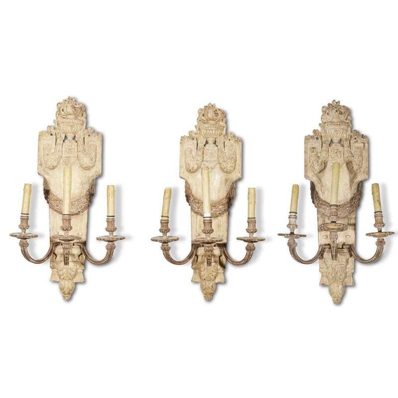 Each with shaped panel surmounted by urns en flambeau and with fruiting laurel garlands, the metal arms with reeding and bellflower decorated nozzles and drip pans, the base with pendant fruiting acanthus finial. (3).
