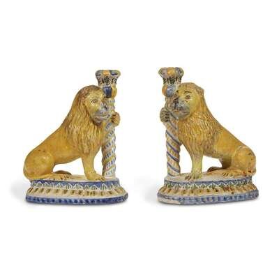 A pair of French faience candlesticks in the form of lions possibly 17th/18th century