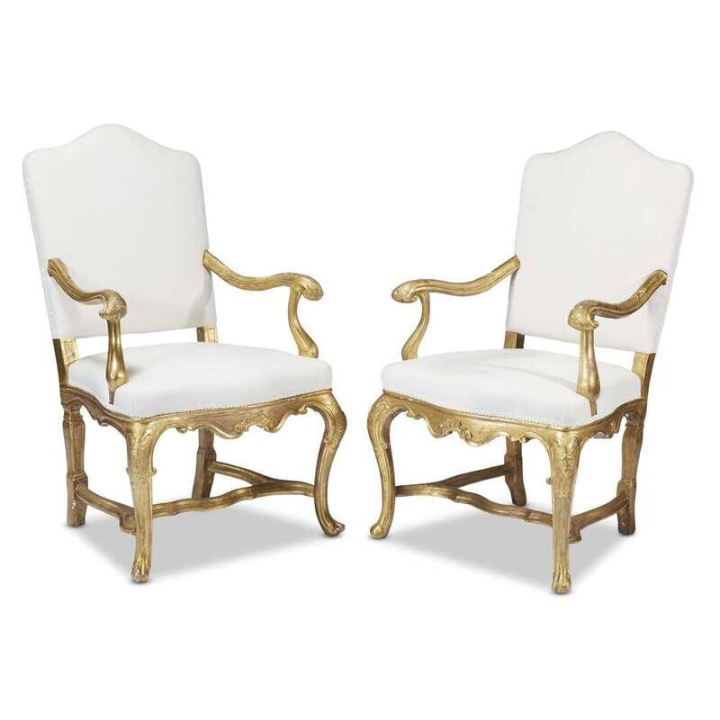 The carved and re-gilt armchairs with inverted bellflower carvings at the knees, the scrolling cabriole legs above a shaped stretcher, the pair now upholstered in muslin. (2).