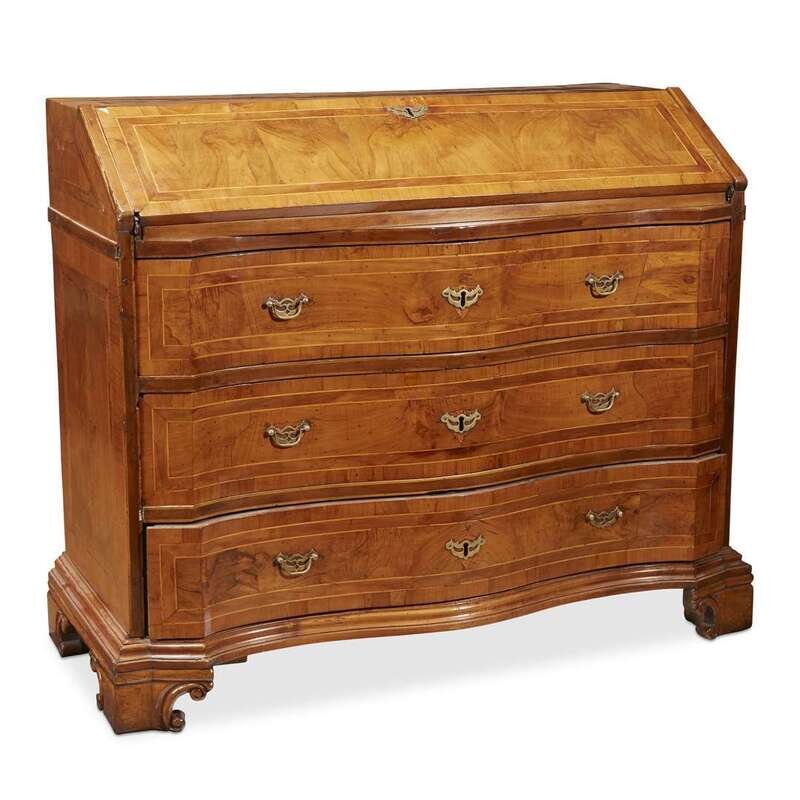 A late Baroque form with chamfered serpentine front below a fall-front opening to reveal eight drawers, the whole on block feet.