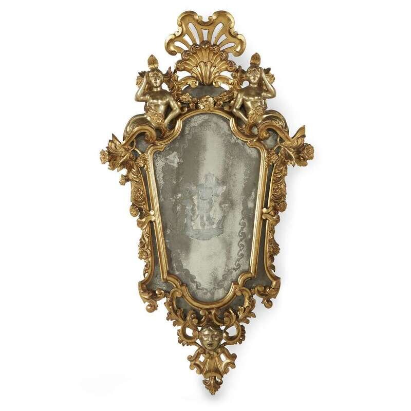 The original shaped mirror plate etched with a figure of a man and birds, the conforming frame with pierced scrolling shell-form pediment flanked by two naiads, the sides with similar scrolling carving terminating in a masque with pendant acanthus carving.