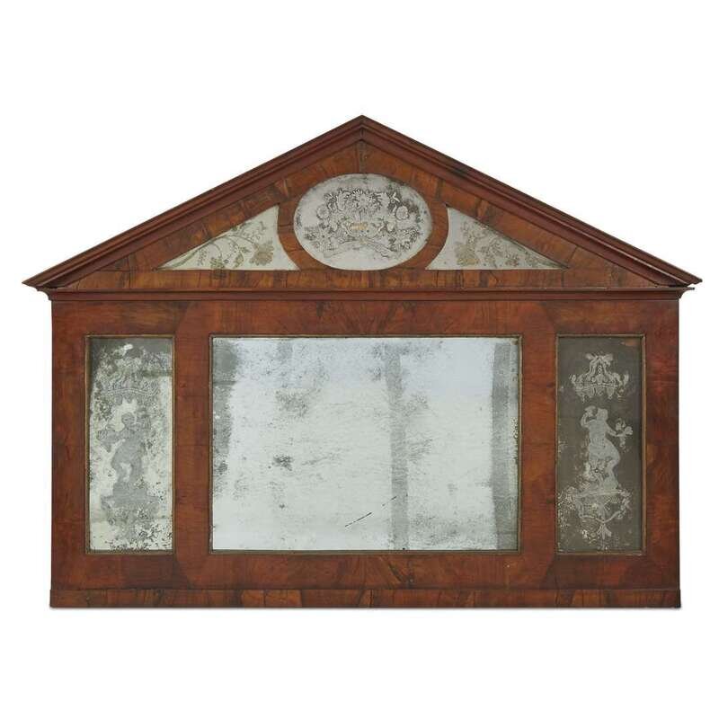 Of unusual Neoclassical form with a pediment centering an etched oval and two shaped rectangular mirror plates with Baroque floral motifs, the central mirror plate (likely replaced) flanked by two etched mirrors with Baroque figures.