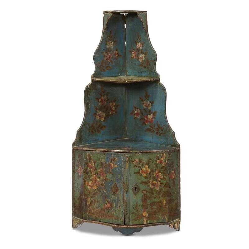 Of serpentine form with two shelves above a two door cabinet, the whole with original chinoiserie polychrome decoration.