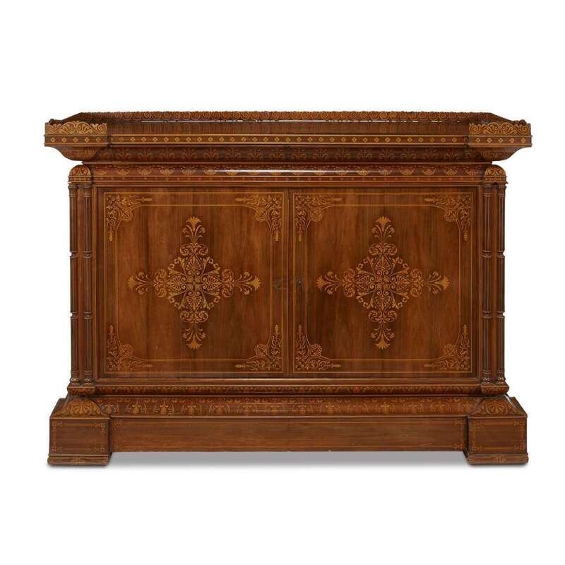 The two-door cabinet with semi-gallery on three sides above a rectangular top inset with thuya burl, the waisted top with triple columnar supports at corners; the whole overall inlaid in neo-Grec patterns after the designs of Pelagio Pelagi, the fitted interior opening to reveal pull-out drawers above a stepped base on block feet.