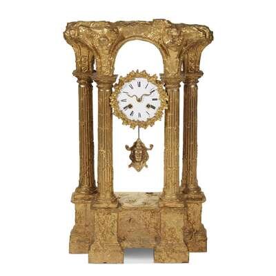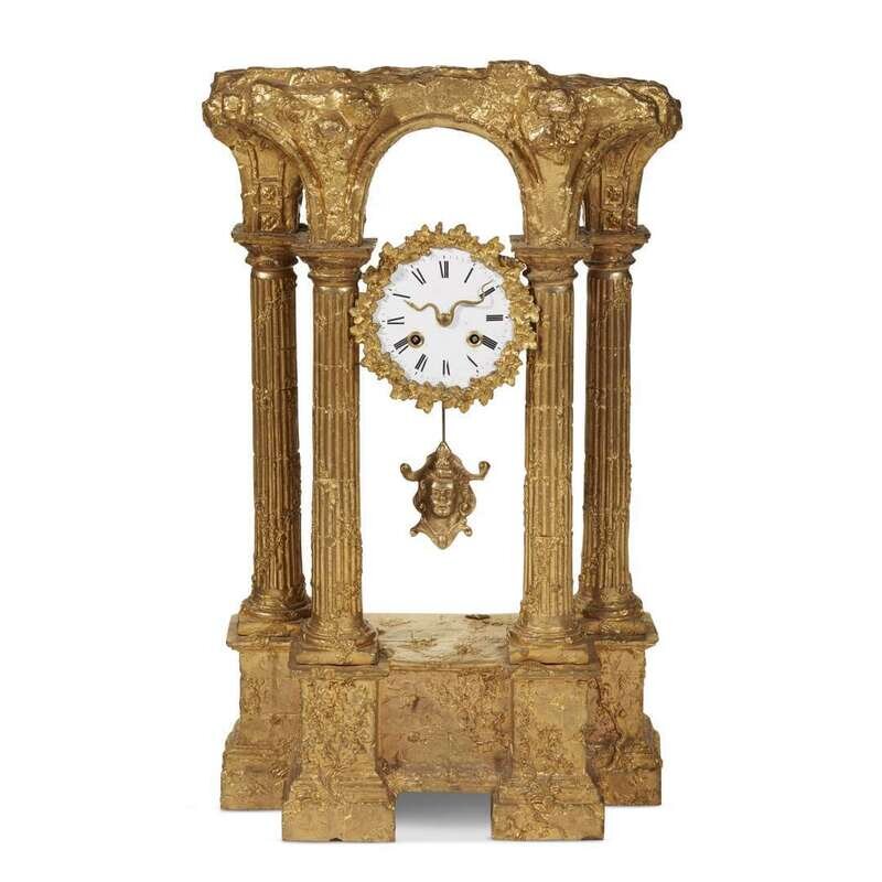 In the form of a Roman ruin, the enamel dial with Roman chapters and snake-form hands surrounded by garlands, the original pendulum with a grotesque masque.