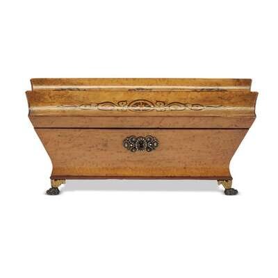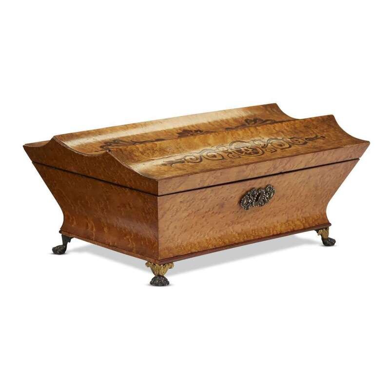 Of canted rectangular form, the convex inscrolled lid with neo-Grec inlay, the whole on giltmetal and patinated bronze lion paw feet; the interior of the lid inscribed with message, likely to finisher, reading: "velour pomecan (?)/ Cuipon en vert broderie riche/tout satin"