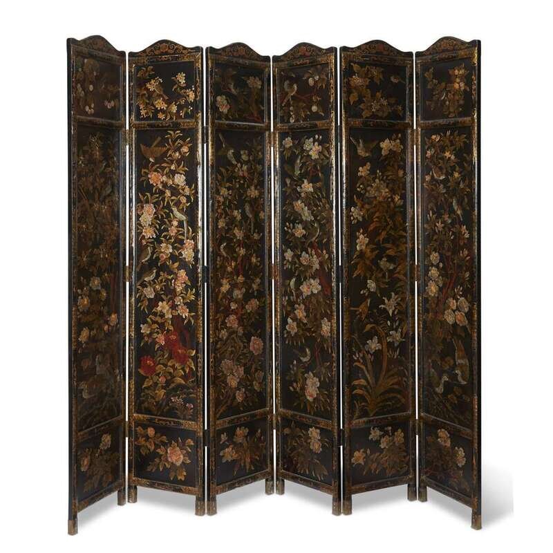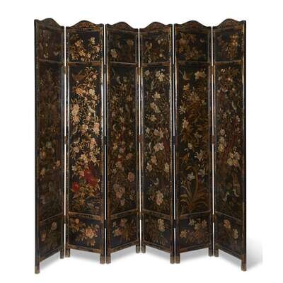 A Chinese export six-panel polychrome decorated lacquer screen Qing Dynasty, circa 1900