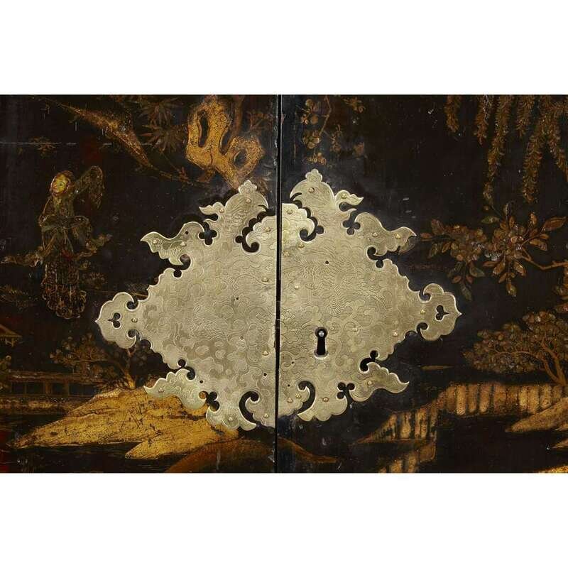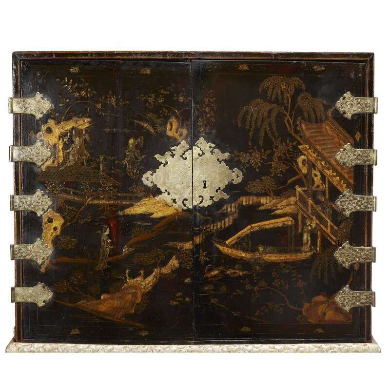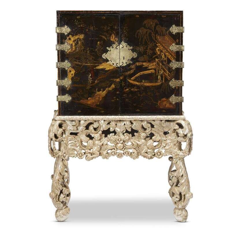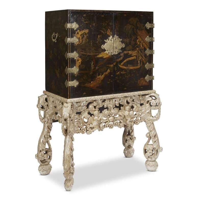 The cabinet decorated in gold and silver on a black ground and inlaid with abalone, the front with two hinged doors decorated with a scene of a garden with a rocky landscape and viewing pavilion with figures, opening to reveal fourteen abalone decorated drawers with pulls, the inner doors similarly decorated, the cabinet with giltmetal fittings comprising an elaborately engraved lock plate and five strap-hinges to each door and with a carrying handle on each side; on an elaborately carved stand silvered and glazed (gilding restored and refreshed), the deep pierced frieze beneath a foliate-carved cornice centered by putti embracing and emerging from acanthus scrolls, the volute supports with scrolling acanthus decoration.