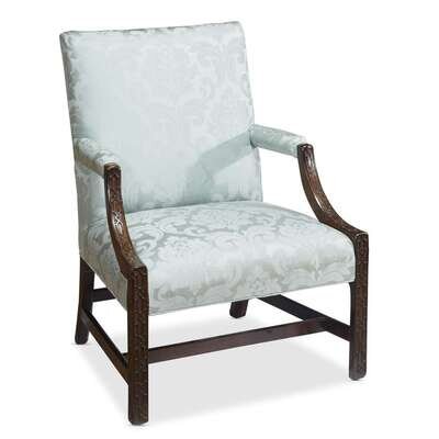 The rectangular blue damask upholstered back with blind fret-carving to the downswept arms and square legs joined by stretchers.
