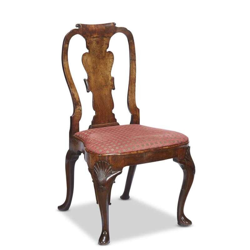With shaped scrolling crestrail above vasiform splat, the shaped seat above acanthus-carved knees on shaped legs terminating in slipper feet.