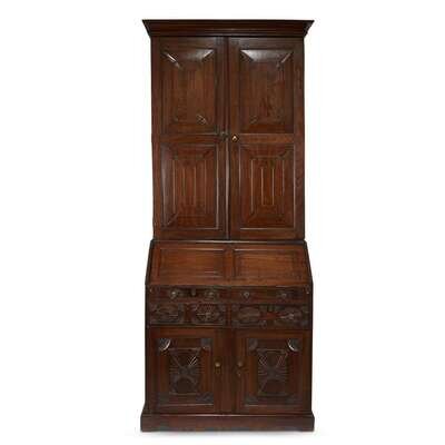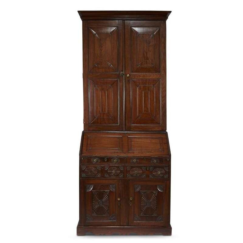 With two double-paneled doors opening to reveal shelves and a drop front opening to reveal an ogee-shaped colonnade, above four drawers and two cabinet doors with relief carving.