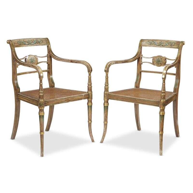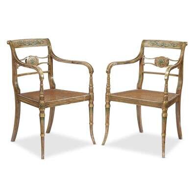 A pair of Regency polychrome decorated caned armchairs second quarter 19th century