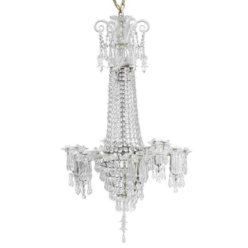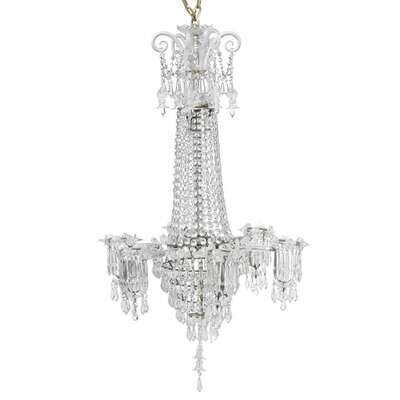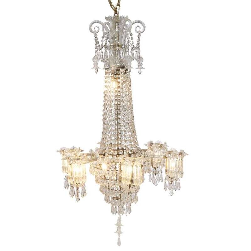 In fountain form with scrolling tassels hung with pendants above a length of crystal, four tiered arms and five descending layers of crystal prisms; originally fitted for gas, the pipes still present.