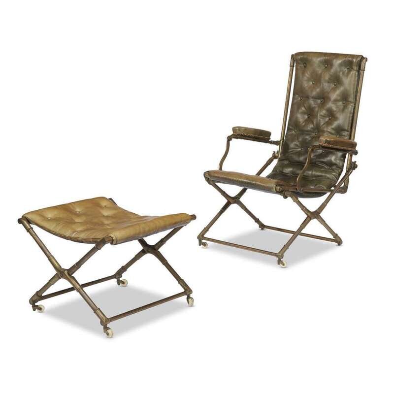 The brass folding chair and stool upholstered in tufted leather, one support stamped "Sedley's Patent". (2).