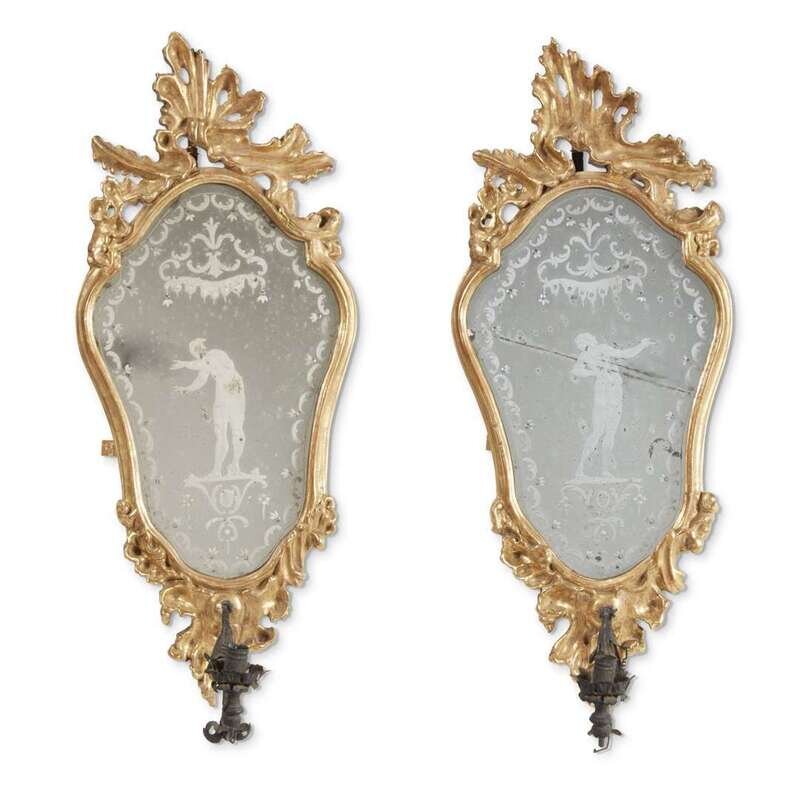 A pair of Italian Rococo giltwood and etched glass specchiere 18th century