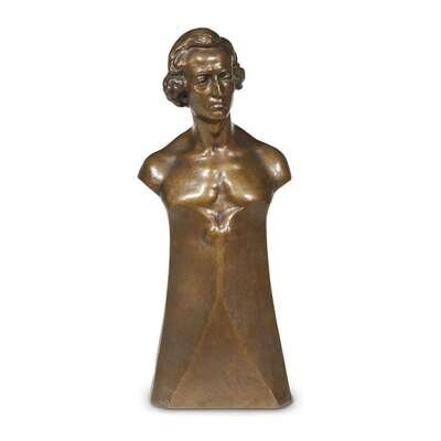 Bronze, warm brown patina, signed and dated in cast "T. Blotnicki, 1907," the composer's head and shoulders atop an Art Nouveau formed herm.