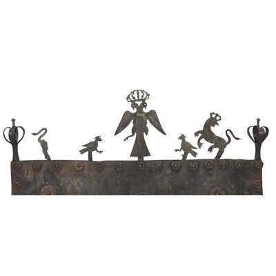 A whimsical collection of Gothic Revival cast and wrought iron fire tools 19th century, some elements earlier