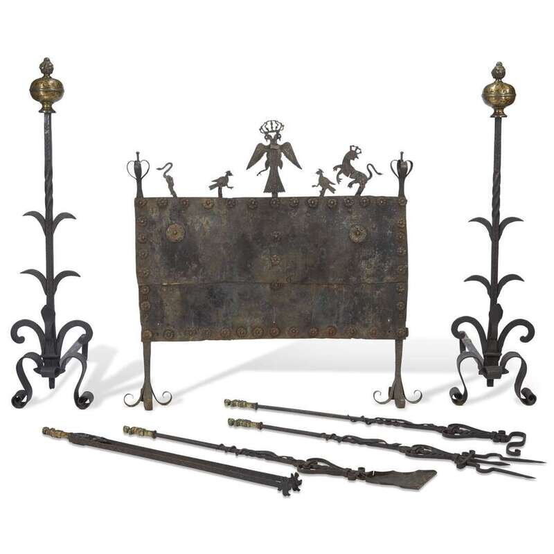 Comprising a fire screen, a pair of andirons, a fire poker, an ash shovel, a fire fork, and a fire hook, and a fire fender. (8).