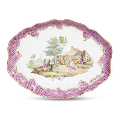 Of scalloped lozenge form, with parcel-gilt raspberry imbricated rim centered by a hand-painted scene of a fête galante; with blue underglaze crossed sword mark to verso.