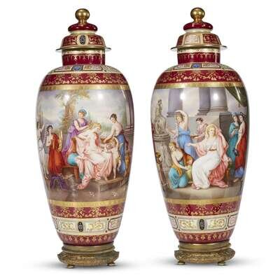 A large pair of ormolu-mounted Royal Vienna hand-painted and parcel gilt covered urns late 19th century