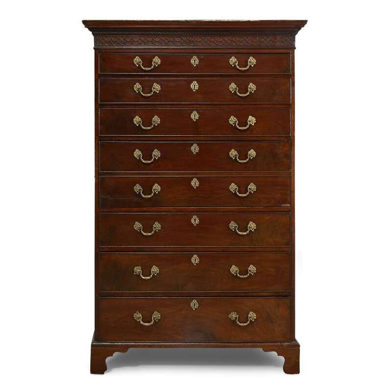 The moulded rectangular top above a blind fret-carved frieze over eight graduated drawers and hidden fall-front secretary compartment; the sides mounted with likely original brass handles and the whole raised on bracket feet.