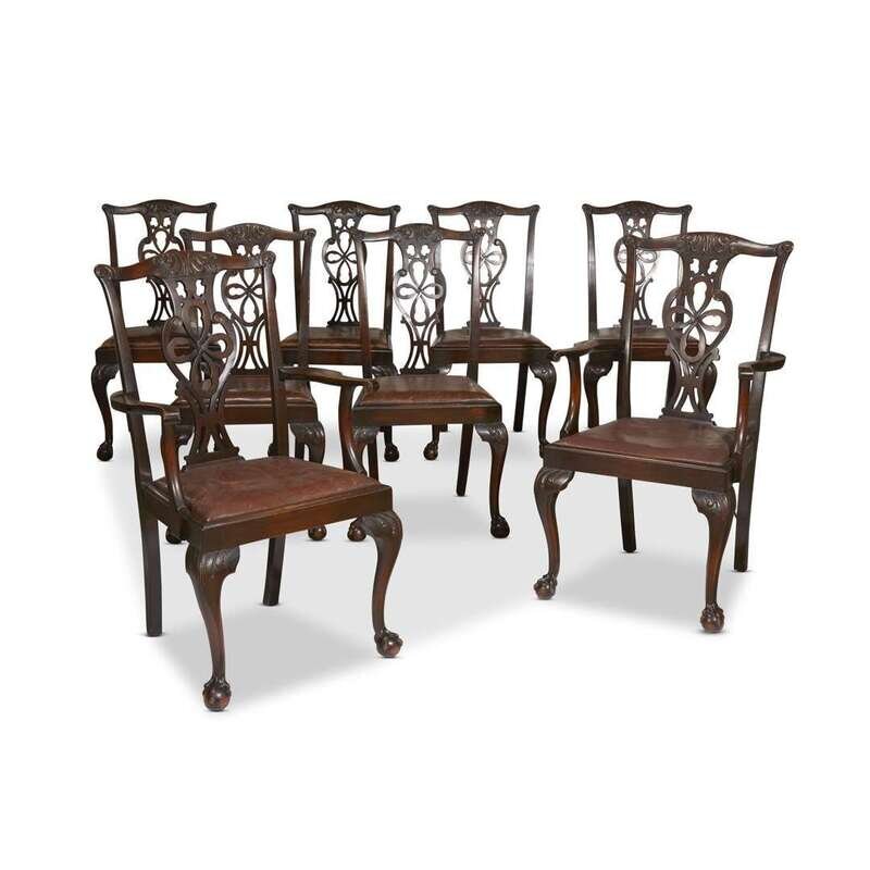 Comprising six side chairs and two armchairs, with leather upholstered seats. (8).
