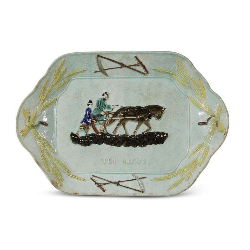 Inscribed in Russian, Urok pakharya "A Lesson in Plowing" in relief at base of cavetto; marked to underside: ‘1 / 97’ impressed in paste.