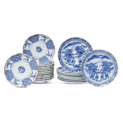 Comprising nine 'Samurai' plates and twelve 'Imari' plates, all in blue and white palette. (21).