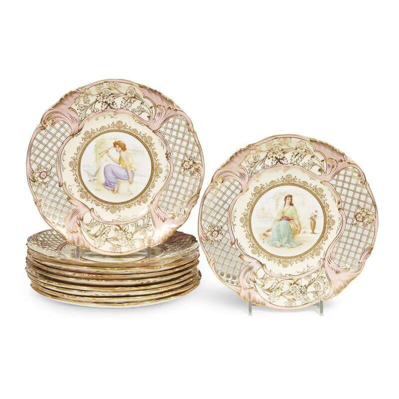 A set of ten Coalport parcel-gilt and hand-painted porcelain reticulated cabinet plates circa 1890