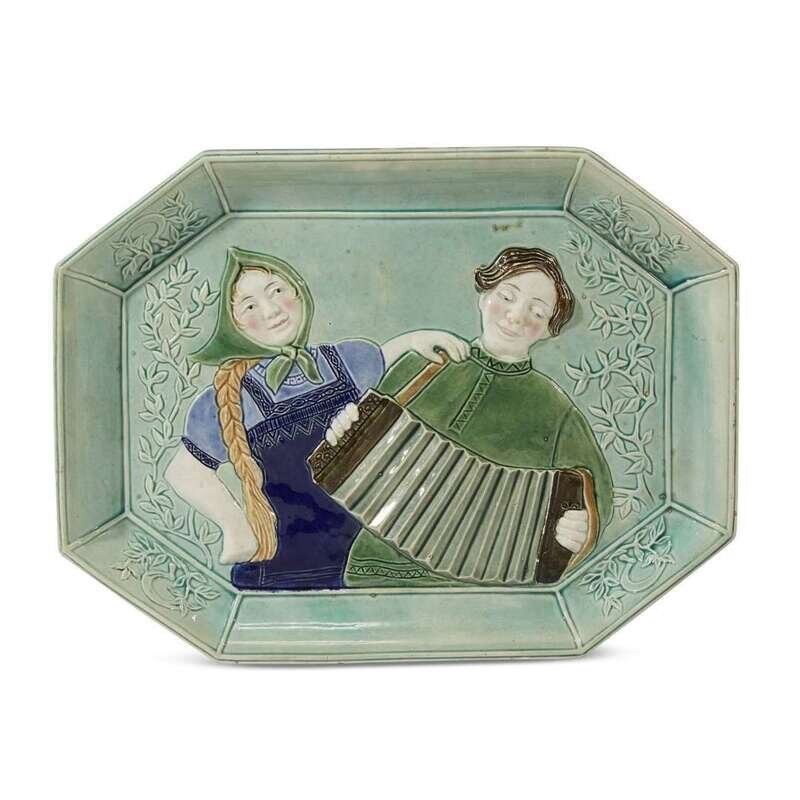 A Soviet faience biscuit plate "Accordion Players" Konakovo Faience Factory, Tver, circa 1930