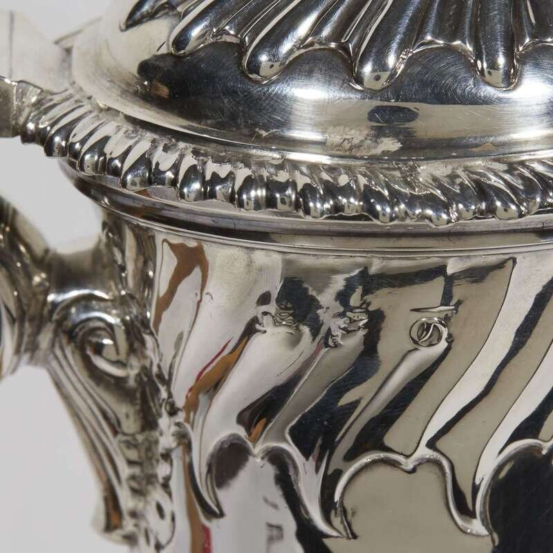 Baluster form with spiral fluted body raised on stepped circular foot, engraved with feline crest to one side; marked to neck and rim of lid.
