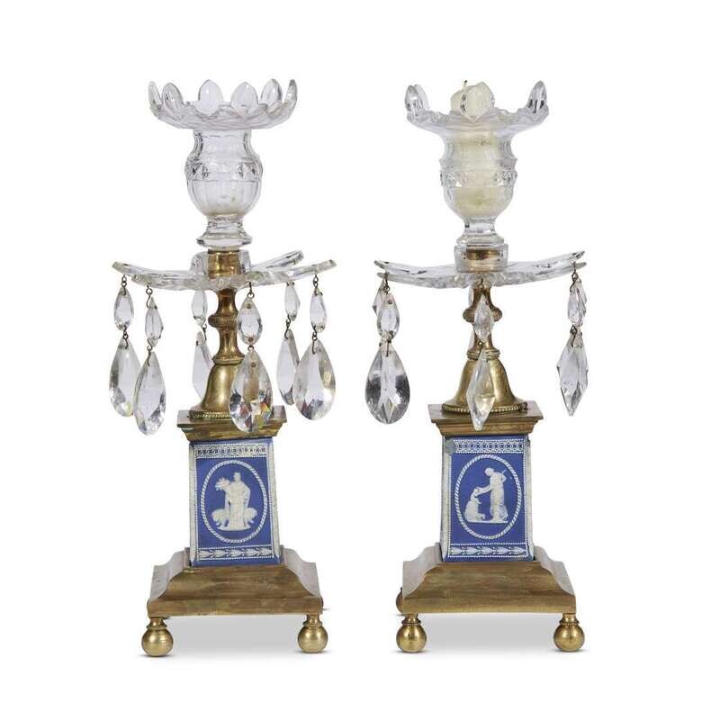 A pair of Regency blue jasperware and cut-glass candlesticks probably Wedgwood, first quarter 19th century