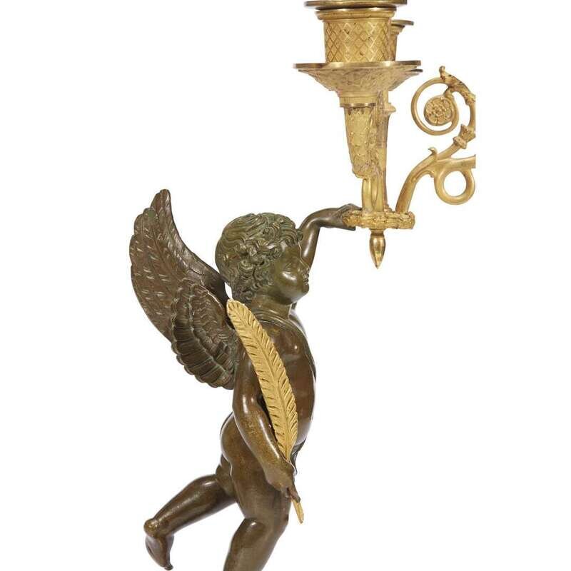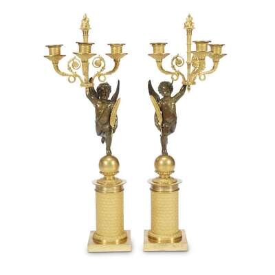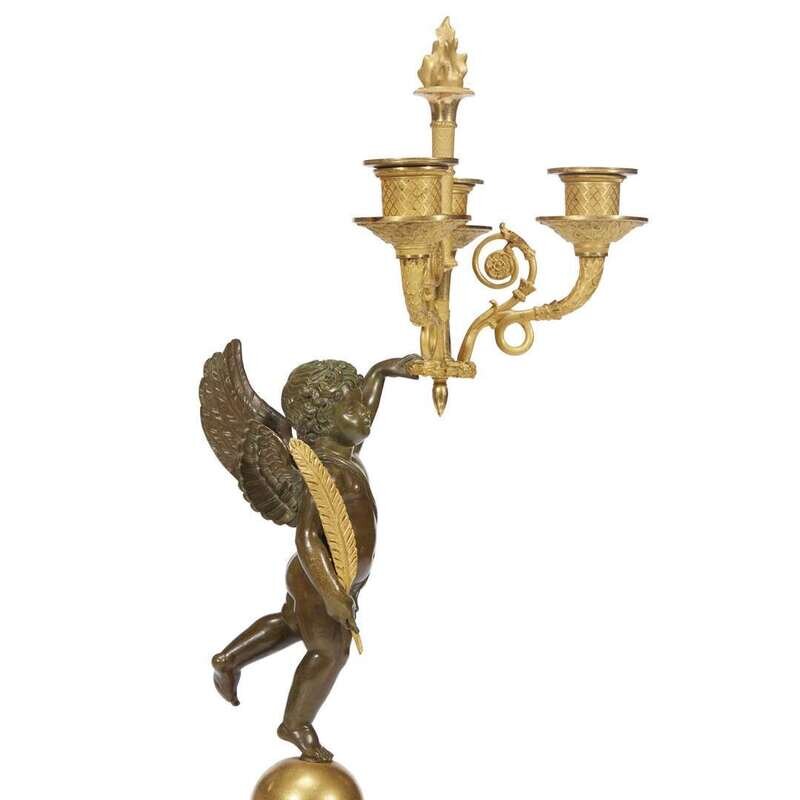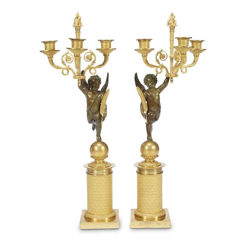 Each very finely cast in the form of a putto holding aloft three scrolled candlearms and a central torch, each standing atop an orb above an engine-turned columnar base. (2).