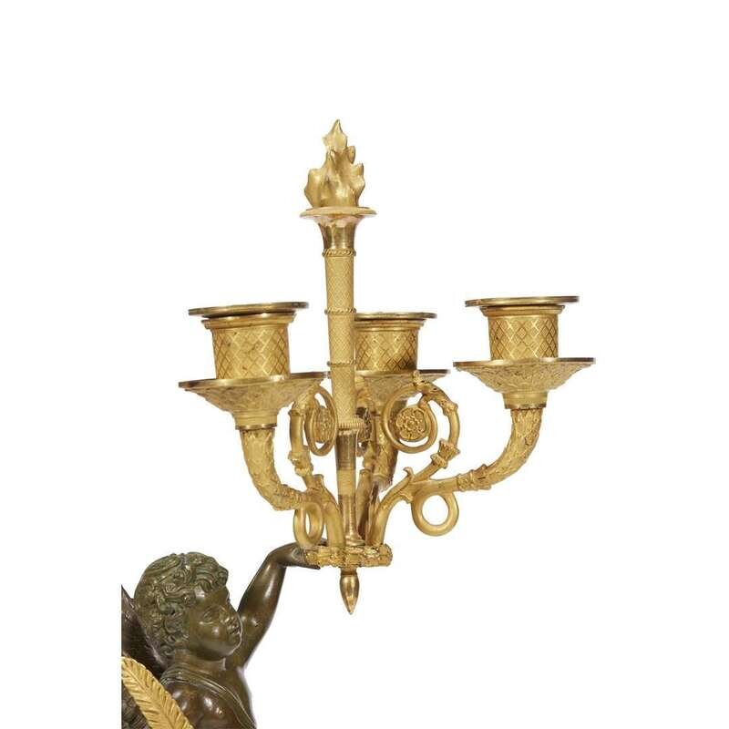 A fine pair of Empire ormolu and patinated bronze figural three-light candelabra attributed to Thomire, Duterme, et Cie., circa 1810