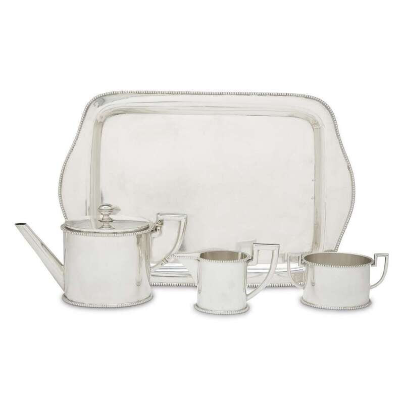 Comprising coffeepot, sugar, creamer, and tray. (4).