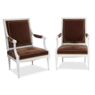 A pair of Louis XVI white-painted fauteuils à la reine upholstered in chocolate silk velvet circa 1780