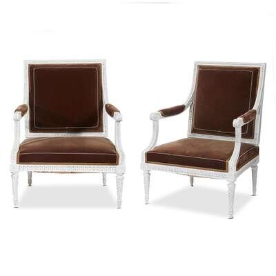 A pair of Louis XVI white-painted fauteuils à la reine upholstered in chocolate silk velvet circa 1780
