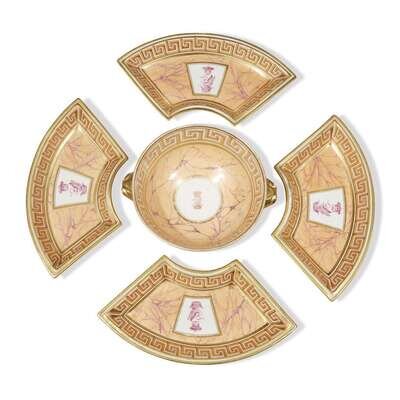Comprising a center bowl with carp-form handles and four sweetmeat dishes; unmarked. (5).