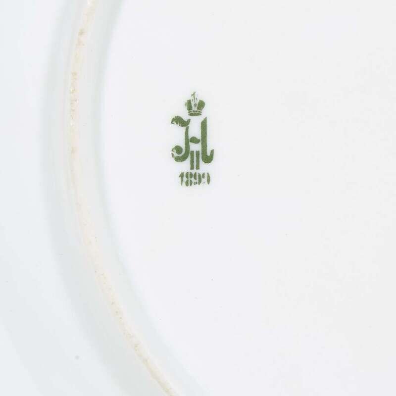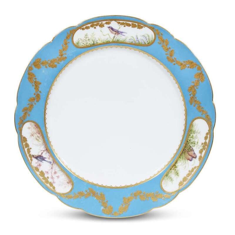 The shaped circular plate with gold rim and a bleu céleste-ground border with cartouches decorated with miniature ornithological paintings separated with garlands of oak leaves and acorns; marked to the underside with the green underglaze mark of Nicholas II and dated 1899.