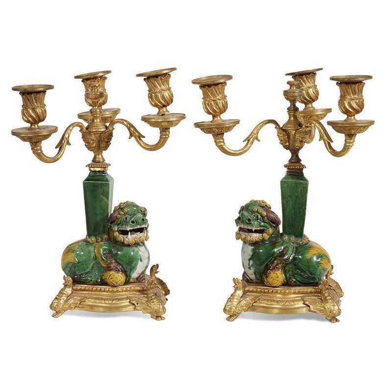 Each with porcelain foo lion-form standard mounted with three scrolling foliate candlearms and raised on serpentine ormolu base with four dragon-form feet. (2).