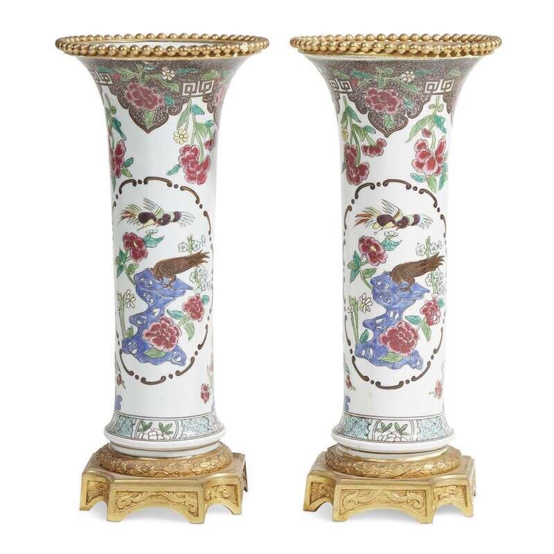 A pair of Louis XVI style ormolu-mounted Chinese export famille verte beaker vases 19th century