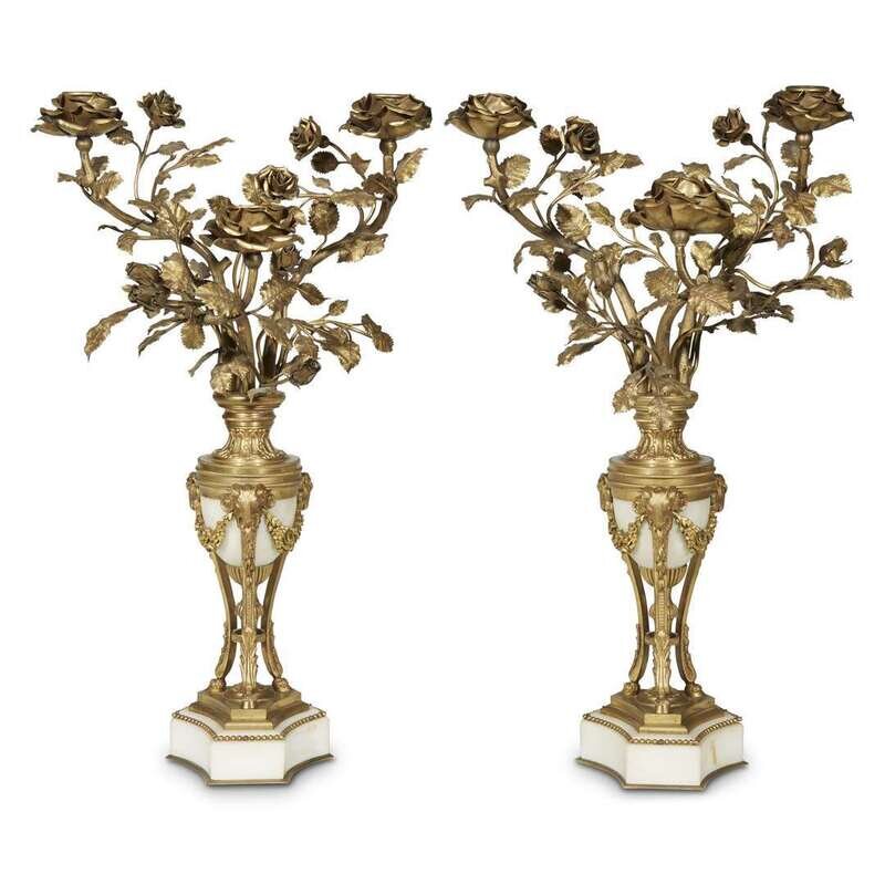 A pair of Louis XVI style gilt-bronze mounted white marble three-light candelabra late 19th/early 20th century