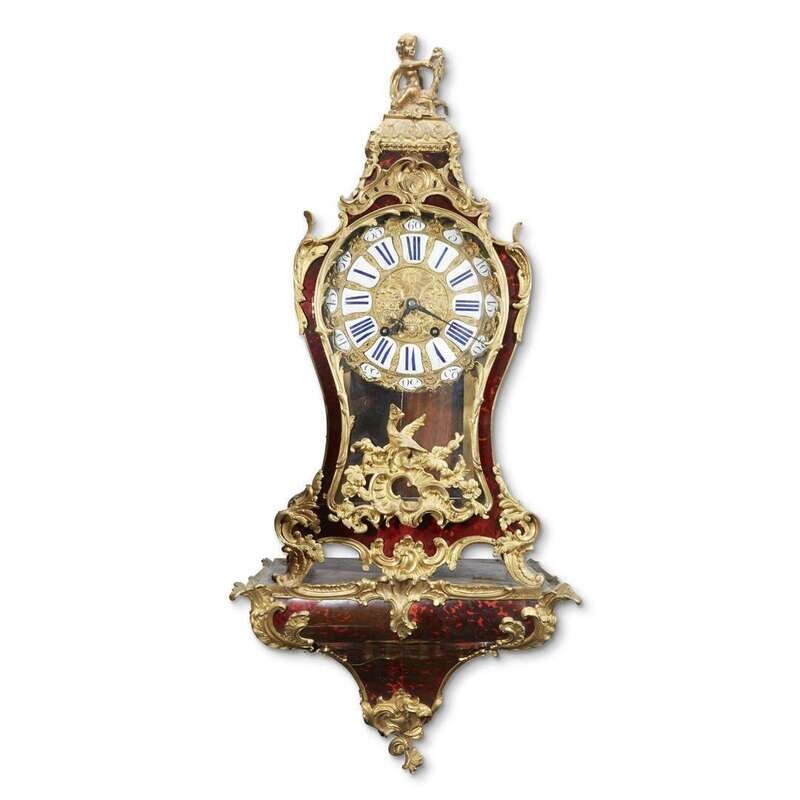 The segmented enamel dial with blue Roman and Arabic numerals housed within an 18th century case, likely originally with kingwood parquetry veneer and now later tortoiseshell-veneered and with some additional 19th century mounts, stamped to verso "F. GOYER" and with JME stamp; the 18th century movement with later replaced crutch and pendulum, the backplate signed "Joubert a Bonetable," the interior of case with original kingwood veneers; the conforming bracket 18th century and with later tortoiseshell veneer and additional 19th century mounts.
