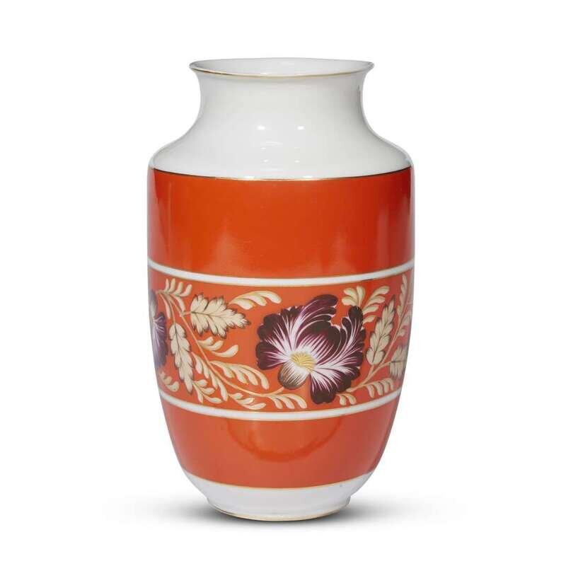 Apparently unmarked, the vase decorated in red-orange with wheat and flower banded decoration the front centering a cartouche with an image of Gorky (1868-1936).
