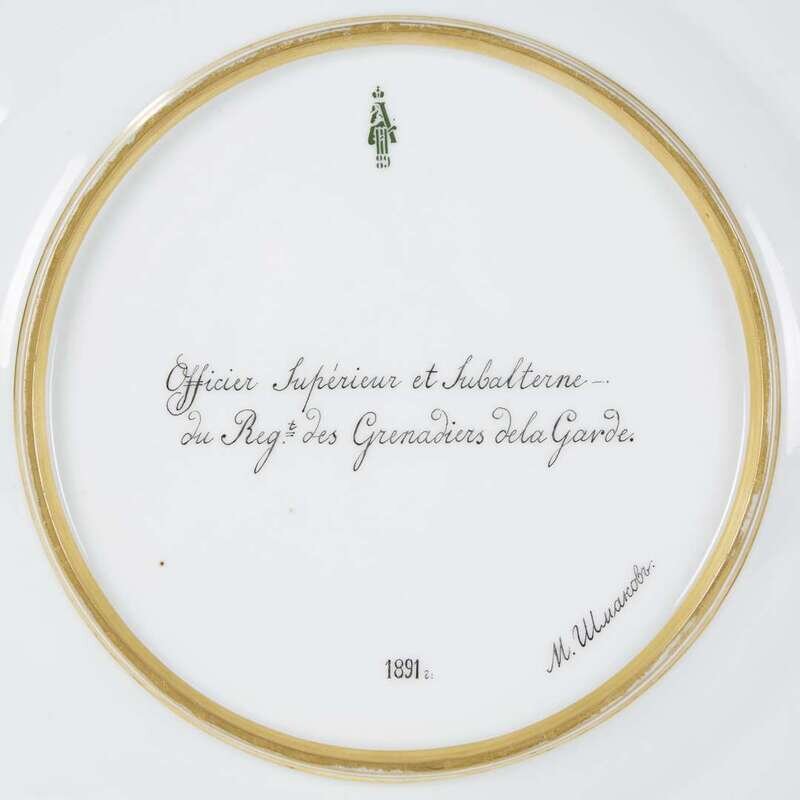 "Officier Superieur et Subalterne du Regt. des Grenadiers de la Garde" [Superior Officer and Subalternate of the Regt. of Grenadiers of the Guard] depicting two Grenadiers at ease in a landscape, the title in French on verso, and with green underglaze cypher of Alexander III dated for 1889, signed M. Shmakov and dated 1891.