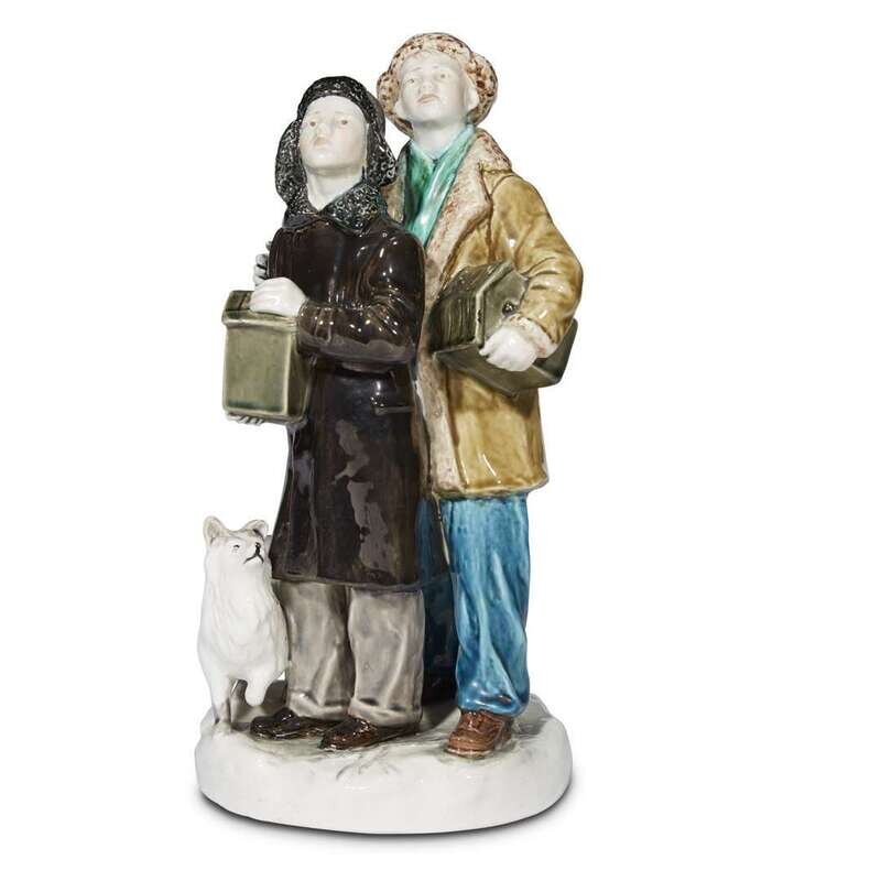 After the model by Maria Petrovna Kholodnaia (1903-1989) designed 1954, and depicting two young boys holding birdcages, marked to underside '59' with the date 1955 in green, '3' and '1' incised in clay, '3 sort' or 'third quality' stamped in green.